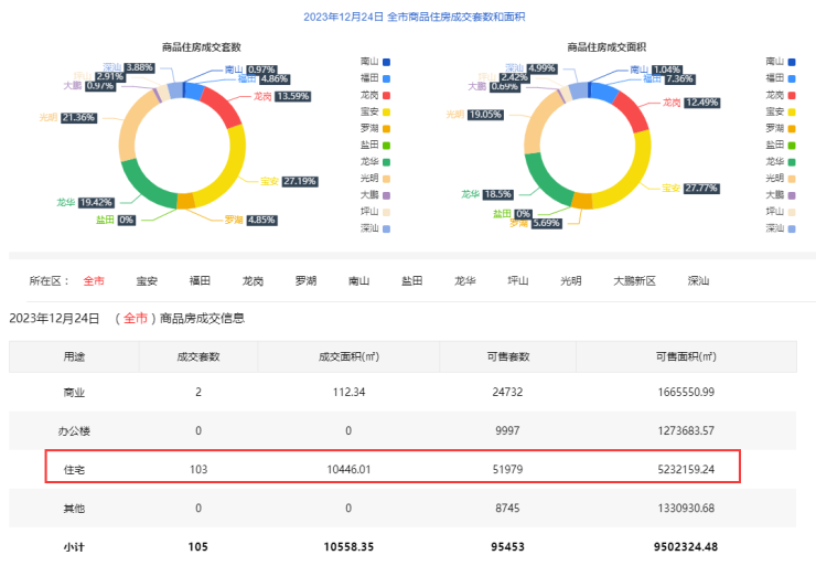 12月24日新房住宅共网签103套。宝安28套;福田5套;龙岗14套;罗湖5套;南山1套;盐田0套;龙华20套;坪山3套;光明22套;大鹏1套;深汕4套。