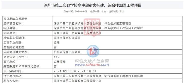 9月8日,深圳第二实验学校高中部宿舍拆建、综合楼加固工程监理公开招标,招标估价563万元。