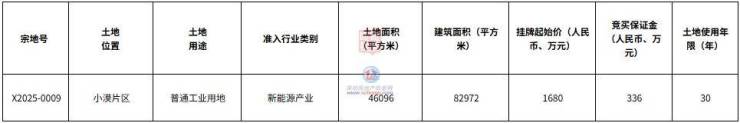 另一宗地为普通工业用地,宗地号X2025-0009,土地位置小漠片区,准入行业类别新能源产业,土地面积46096平方米,建筑面积82972平方米,挂牌起始价1680平方米,土地使用年限30年。