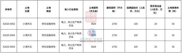 3宗地均为供应设施用地,土地位置位于小漠片区,宗地号分别为X2025-0002、X2025-0004、X2025-0005,准入行业类别电力、热力生产和供应业,土地面积均为3829平方米,建筑面积均为2750平方米,挂牌起始价100万元,土地使用年限30年。
