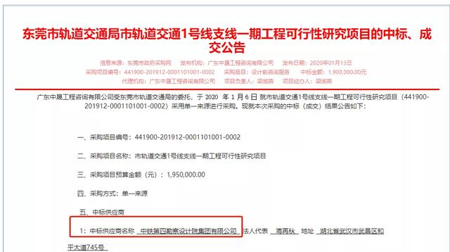 近日,老牛从中国政府采购网获悉,东莞地铁1号线支线一期已完成可行性研究项目招标工作,中标方为中铁第四勘察设计院集团有限公司。这意味着1号线支线的相关工作已经着手开始。