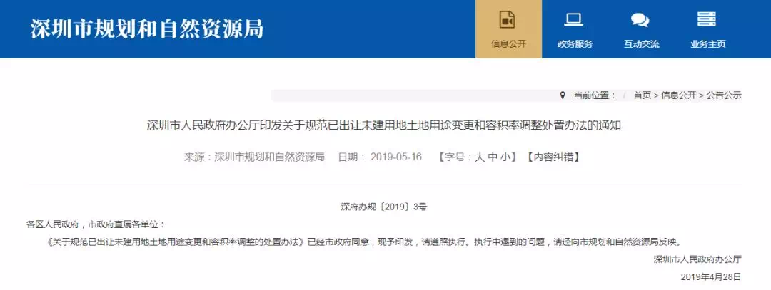 《关于规范已出让未建用地土地用途变更和容积率调整的处置办法》(深府办规〔2019〕3号,以下简称《处置办法》),于3月26日经市政府六届一百六十四次常务会议审议通过,并于5月9日在《深圳市人民政府公报》2019年第17期公布实施,有效期五年。