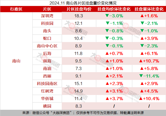 据中原监测南山区的13个片区中数据显示,挂盘均价下跌的片区有5个,上涨的片区有7个,上涨片区占比53.8%,上涨的片区也明显增加。