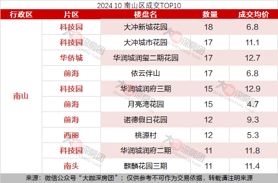 山区成交量最高的是科技园的大冲新城花园,10月共成交了18套,目前成交均价为6.8万元/㎡。