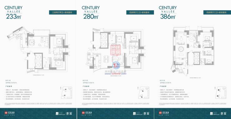深业世纪山谷花园世家项目本批次推售342套纯大户型住宅,位于3栋A/B两座。户型涵盖建面约233/280/386㎡大平层(带装修),以及16套建面约420-1080㎡高空复式(毛坯)。