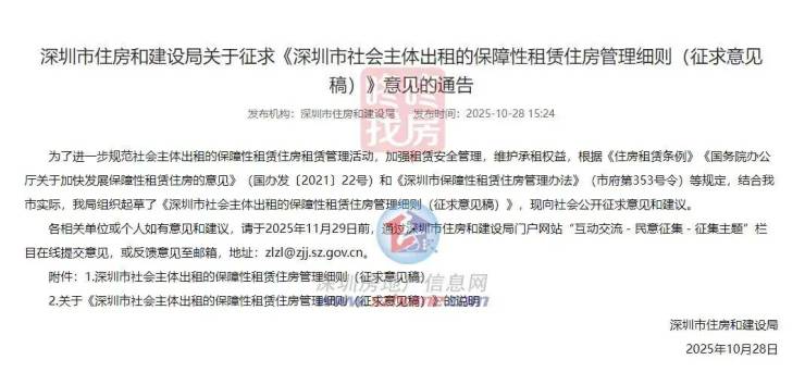 为进一步规范由社会主体出租的保障性租赁住房的管理,近日,深圳市住房和建设局发布了《深圳市社会主体出租的保障性租赁住房管理细则(征求意见稿)》,从10月28日起向社会公开征求意见。