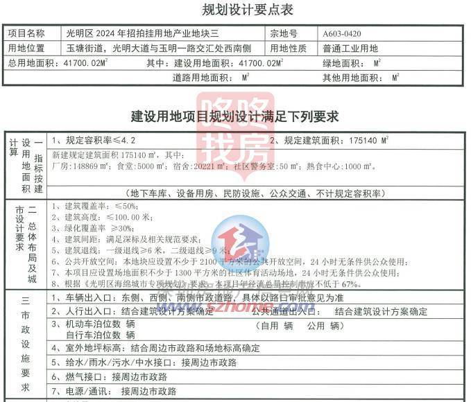 地块宗地号A603-0420,位于光明区玉塘街道,土地用途普通工业用地,准入行业类别《国民经济行业分类》中的“39计算机、通信和其他电子设备制造业”,土地面积41700.02平方米,建筑面积175140平方米,挂牌起始价14100万元,土地使用年限30年。