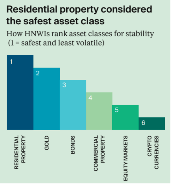 特别在当下经济下行期,全世界反而有越来越多财富流向房地产。就在今年初,莱坊国际(Knight Frank)发布了2023年全球超高净值人士投资理财消费的综合《财富报告》,报告显示,全球高净值人士认为房产是最安全的资产类别,甚至超越了黄金和债券。