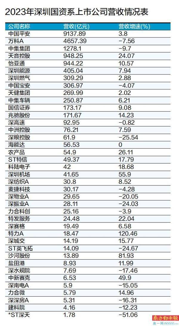 南都湾财社记者注意到,营业收入超过100亿元的深圳国资系A股上市公司,共有12家,分别是中国平安、万科A、中集集团、天音控股、怡亚通、深圳能源、深圳燃气、中国宝安、天健集团、中集车辆、国信证券和兆驰股份。