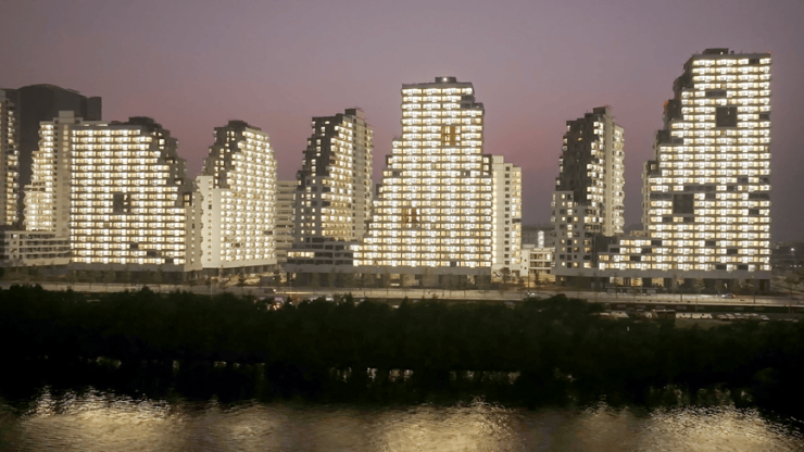 在海边,十一栋企鹅公寓映入眼帘,呈现模数化排列,这种理科浪漫主义设计也象征着互联网企业的技术底色。这些建筑采用了类似梯田的形态,组合构成四座山形的公寓楼组团,并在每栋公寓楼组团中心设置了绿色庭院,让入住的年轻人们可以信步踏入户外空间,将西面大海、东面海湾的风光尽收眼底。