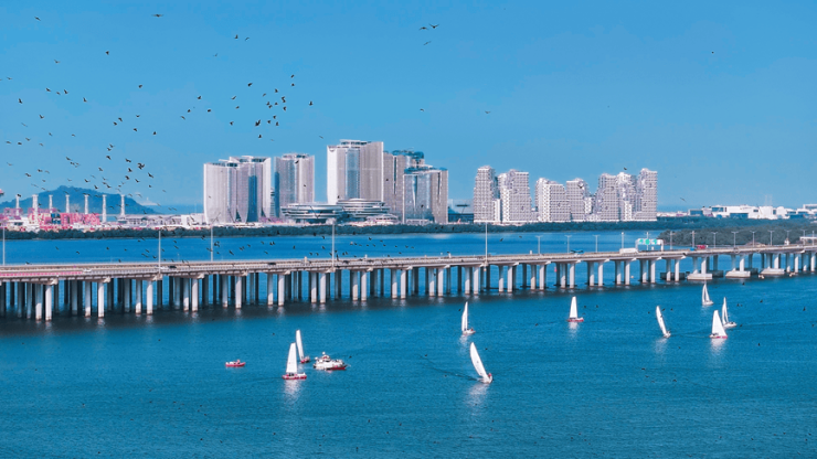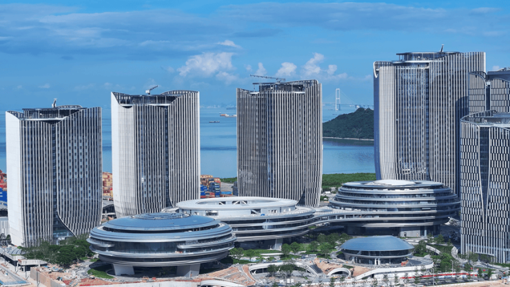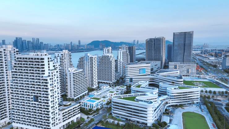 04街区主要为办公、会议、展览场景使用。三座腾云中心、六座云海大厦办公楼等建筑,就“长”在中央绿脊上,形成“环状纽带”式结构。整个04街区建筑高度自陆地向海洋逐渐降低,像海风轻拂下流动的城市天际线,将提供互联共通的花园式办公场所。首批试运营范围为云海大厦其中两栋办公楼。