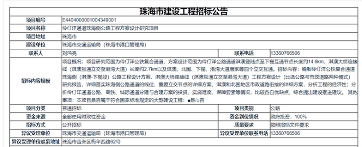 《招标公告》显示,深珠通道项目研究范围为伶仃洋公铁复合通道,方案设计范围为伶仃洋公路通道淇澳登陆点至下栅互通节点长度约14.6km,淇澳大桥连接线(淇澳互通立交至港湾大道)长度约2.7km以及淇澳、北围、下栅、港湾大道唐家等四个立交互通。