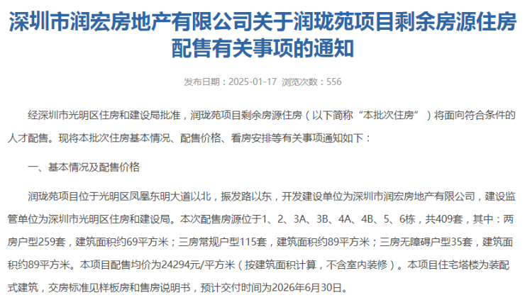 日前,光明住建局发布人才房润珑苑剩余房源的配售公告,共409套,线上申请认购时间为:2025年1月17日18:00至2025年2月10日18:00。