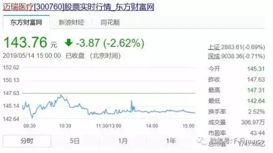结果,截至次日收盘,迈瑞医疗股价为143.76元每股,单日跌幅为2.62%,对应的总市值为1747.7亿元,较前一天减少了47.03亿元。