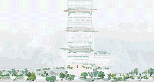 一条条垂直的梯阶和悬臂,形成一个个充满趣味性的空中院落,供人们探索;结合塔楼不同功能,将架空层设计成满足不同使用需求的共享空间。