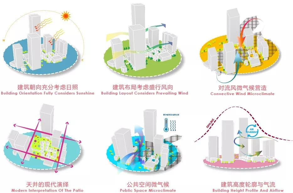 设计团队在对国际LEED 认证,中国绿建等标准进行学习研究,同时总结多项的低碳技术、政策与措施后提出7 个高密度低碳的探索与实践用以指导整个项目的设计。
