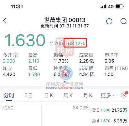 7月31日,世茂集团复牌首天,但却出现股价大幅跳水,截止发稿,股价跌63.12%,报1.63港元,成交额2.28亿港元,换手率6.01%。