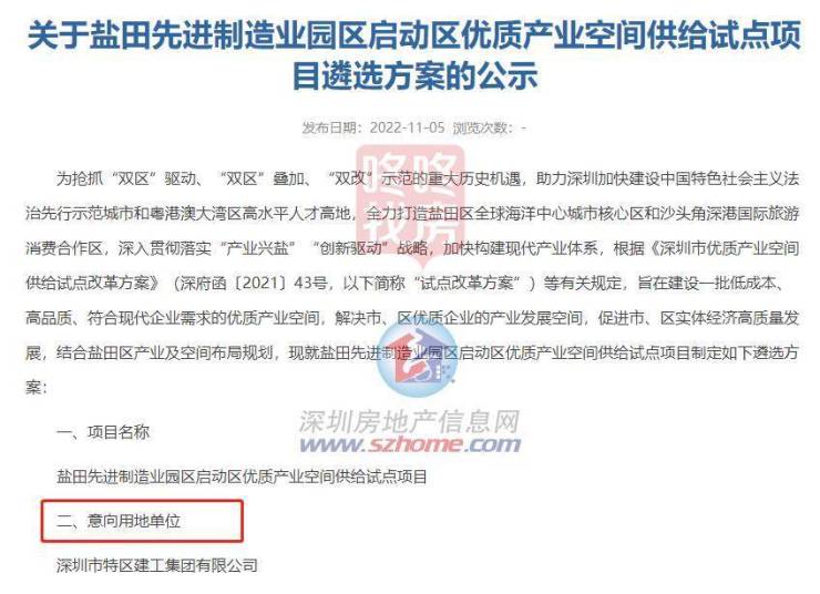 11月5日,盐田区工业和信息化局发布《盐田先进制造业园区启动区优质产业空间供给试点项目遴选方案》。意向用地单位为深圳市特区建工集团有限公司。