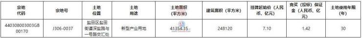 宗地号J306-0037,土地位置盐田区盐田街道深盐路与一号路交汇处,土地用途新型产业用地,土地面积41354.35平方米,建筑面积248120平方米,挂牌起始价7.10亿元,土地使用年限30年。