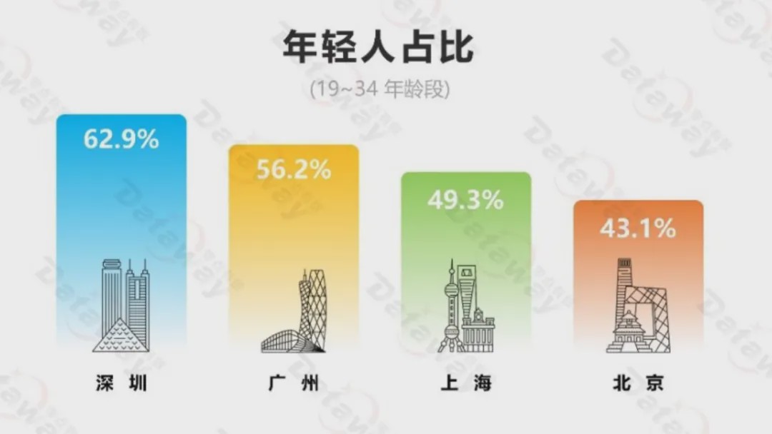 在2019年《城市商业魅力排行榜》中,深圳年轻人比例位居四大一线城市之首,高达62.9%。