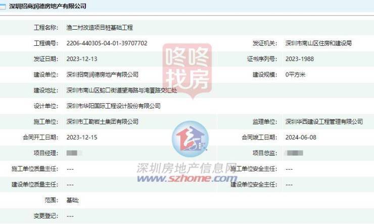 12月13日,深圳住建局官网公示渔二村改造项目桩基础工程施工许可,项目为深圳招商润德房地产有限公司建设,计划12月15日开工。