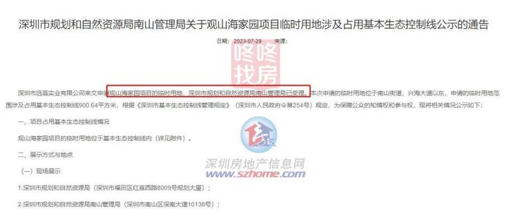 7月29日,深圳市远荔实业有限公司来文申请观山海家园项目的临时用地,深圳市规划和自然资源局南山管理局已受理。本次申请的临时用地位于南山街道,兴海大道以东,申请的临时用地范围涉及占用基本生态控制线900.64平方米。