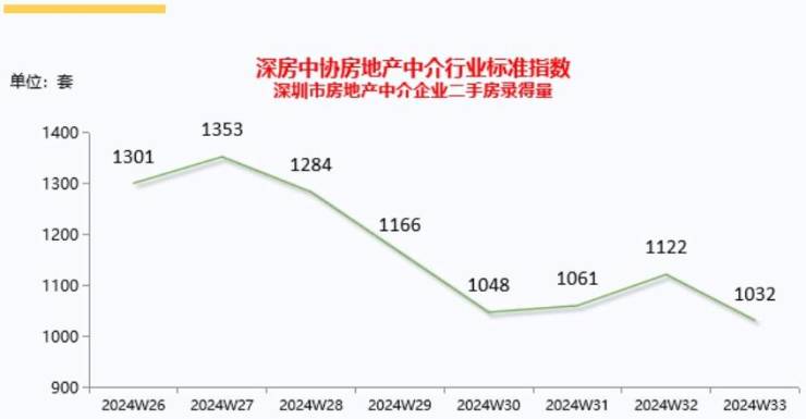 经深房中协统计,2024年第33周全市二手房(含自助)录得1,032套,环比下降8.0%。二手房交易量波动下滑,但从绝对值量看,单周仍保持在千套水平以上,市场整体运行状态相对良好。