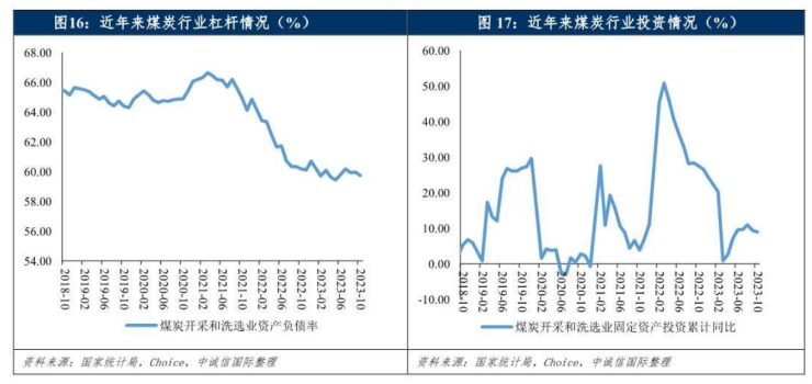 搜狐财经根据中诚信国际报告梳理发现,从2018年开始煤炭行业的杠杆率一直处于波动下行的趋势,而近年来煤炭开采和和洗达业固定资产投资累计同比逐渐下滑,在2022年6月达到近5年来最高点50%,至2023年占比达到10%。