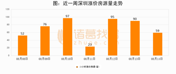 根据诸葛找房数据显示,深圳24小时涨价房源量为59套,较08月13日减少31套,环比下降34.4%。与此同时,涨价房源占比小幅回落,对于购房者来说是一个入市窗口期,购房者可抓住时机入市。