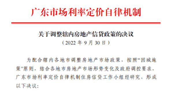 9月30日,一份广东市场利率定价自律机制的《关于调整辖内房地产信贷政策的决议》的消息在坊间传开,决议显示,广东辖内(除广州)从10月1日起,执行:首套和二套商品住房“认房不认贷”政策;以及部分地市的首套房首付和税率 调整信息。