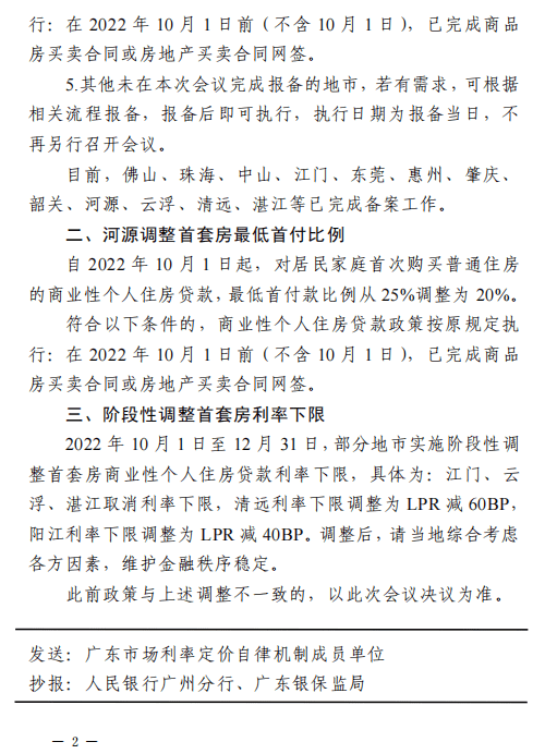 10月1日-12月31日,部分地市实施阶段性调整首套房商业性个人住房贷款利率下限,具体为:江门、云浮、湛江取消利率下限;清远利率下限调整为LRP减60BP,阳江利率下限调整为LPR减40BP。