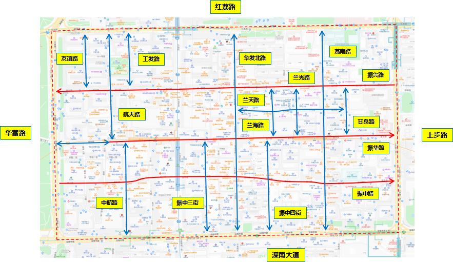 货车限时通行区管制范围:上步路、深南大道、华富路、红荔路围合范围内所有道路(不含4条边界道路)。