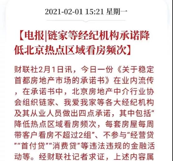 2月1日,北京传出:为了限制二手房市场交易热度,监管部门要求中介机构降低“带看频次”,一周之内,每套房子被买家看的次数不超过2组;不参与“经营贷”、“首付贷”、“消费贷”等违法违规金融活动。