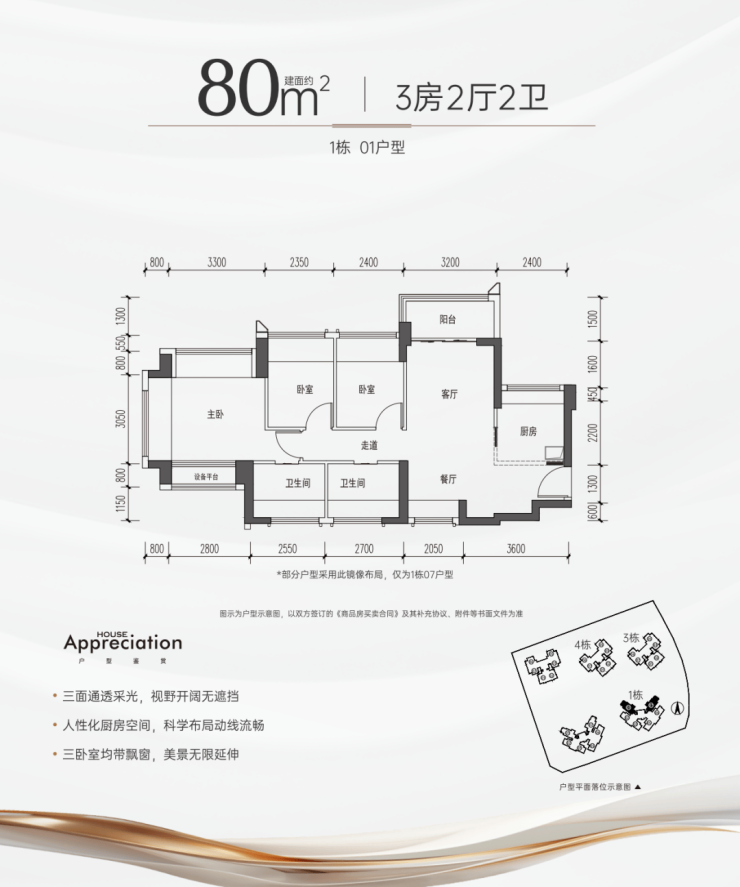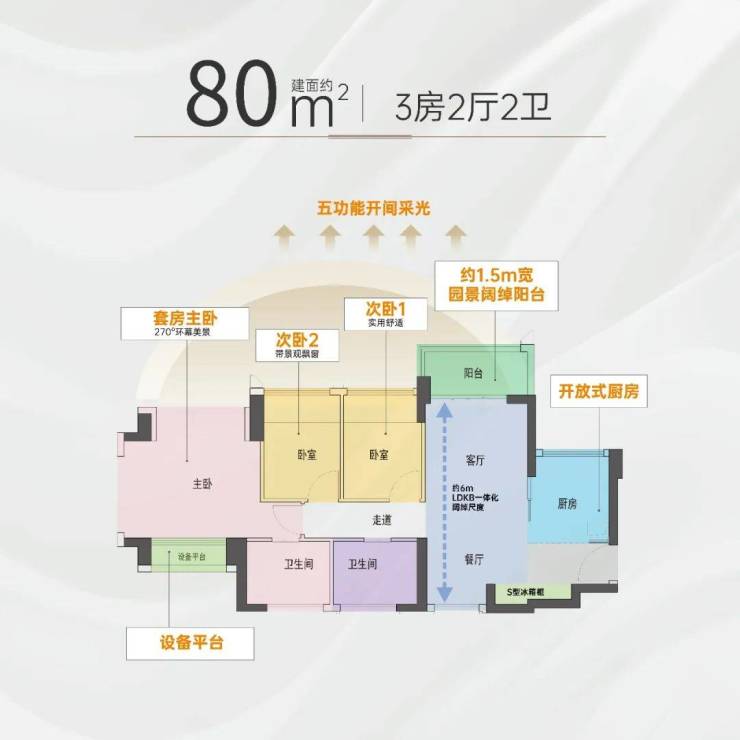 以建面约80㎡3房2卫为例,全屋共8个飘窗,赠送面积约14.34㎡; 阳台进深1.5m,赠送面积2.4㎡;设备平台面积约2.24㎡ ,综合得房率约104%!