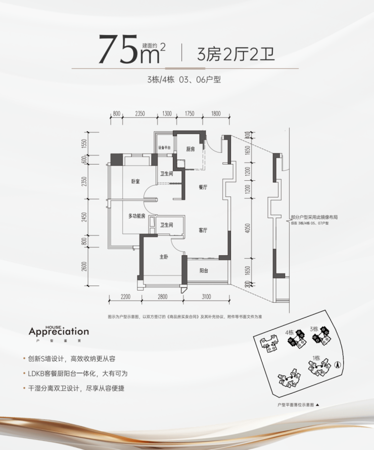 也就是说,买入这套75㎡的户型,比别的项目少出5㎡+的资金就可以实现一步到位,以单价4.4万/㎡来计算,总价省出了22万+!