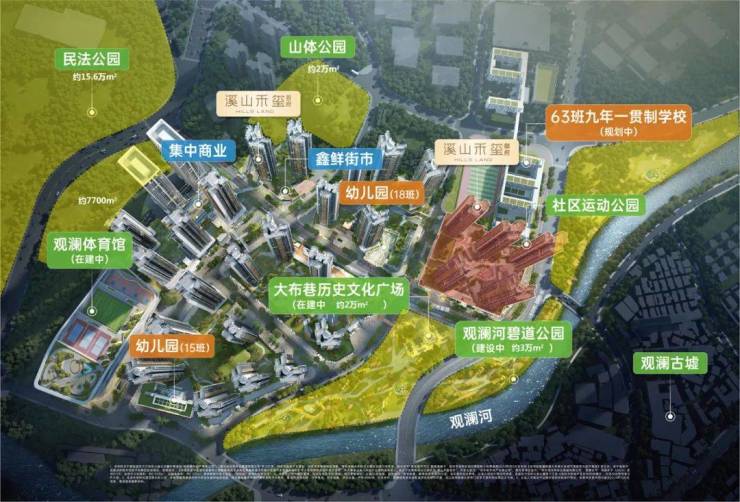 溪山禾玺,位于龙华观澜中心、观澜河畔,规划为百万建面的滨水生活大城,是集住宅、商业、写字楼、学校、公园、文体设施等业态于一体的大型综合体。