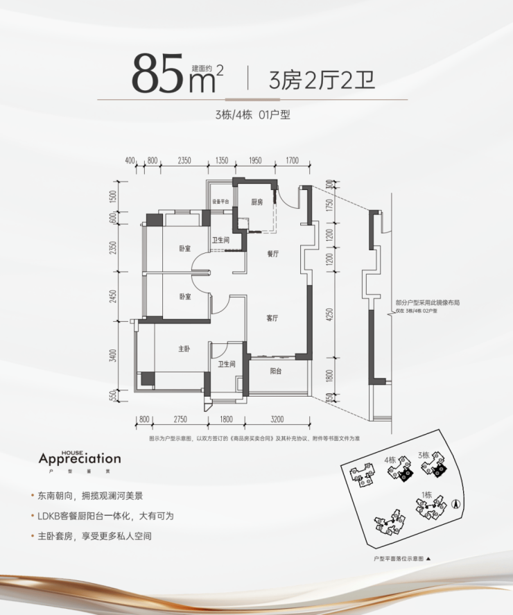 这个户型可以对标市面上大部分90㎡+的3房,该户型为东南向。
