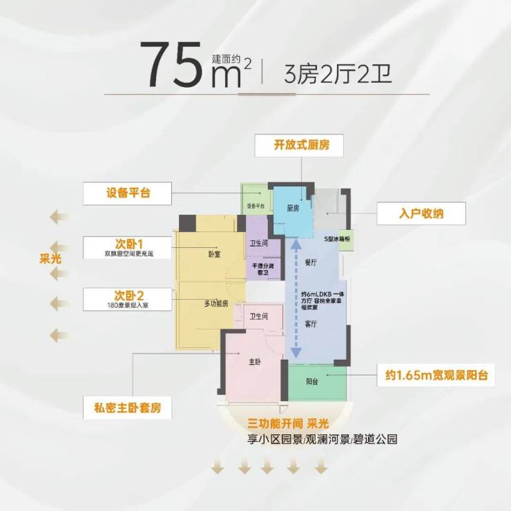 值得注意的是,作为龙华首个建筑新规住宅项目,溪山禾玺首批推出的高拓户型备受市场青睐,而本期产品原有优势上再迭代升级,亮点更加突出。其中,建面约75㎡神户型可一步到位3房2卫!