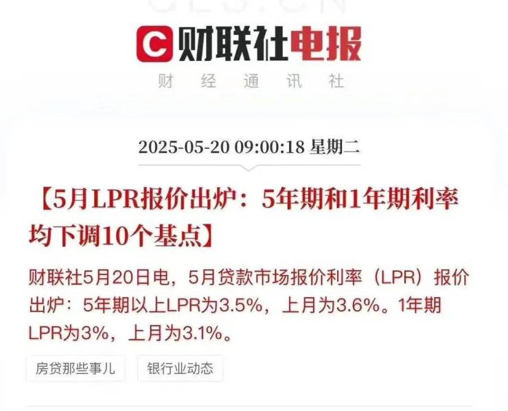 5月20日,LPR如期下调10基点,1年期LPR降至3.0%,5年期LPR降至3.5%。