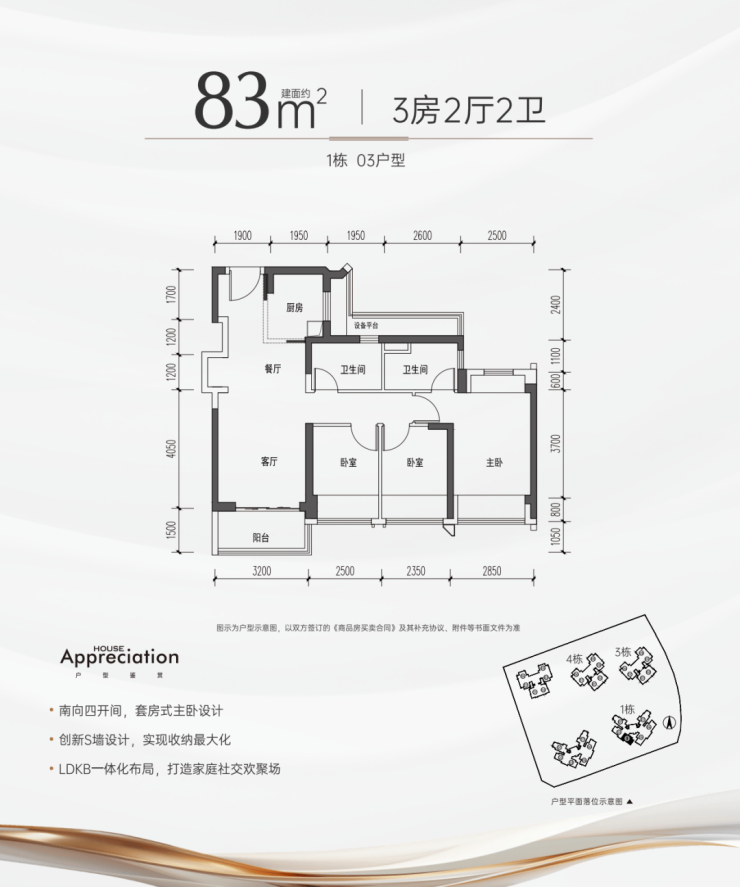 产品有3房、4房选择,为建面约75㎡3房2卫、80㎡3房2卫、83㎡3房2卫、85㎡3房2卫,以及建面约94㎡4房2卫、105㎡4房2卫。