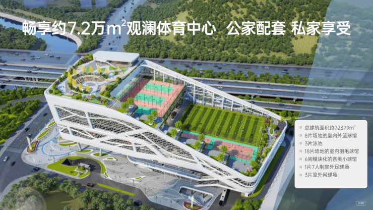约2万㎡的禾玺文化活动中心,规划有演艺馆、少年宫、图书馆等多元休闲配套;观澜体育中心是一所区域地标级综合性体育运动中心,规模约7.2万㎡,包含室内外篮球馆、泳池、羽毛球馆、足球等运动休闲设置。