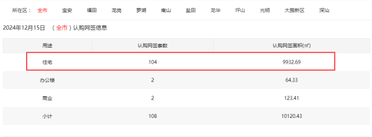 2024年12月14日新房住宅认购网签104套。其中,宝安22套;福田1套;龙岗7套;罗湖3套;南山0套;盐田4套;龙华20套;坪山29套;光明18套;大鹏0套;深汕0套。其中,宝安43套;福田5套;龙岗37…