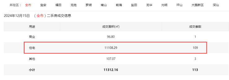 2024年12月14日二手房住宅网签109套。其中,宝安27套;福田10套;龙岗29套;罗湖8套;南山20套;盐田6套;龙华8套;坪山4套;光明3套;大鹏0套。