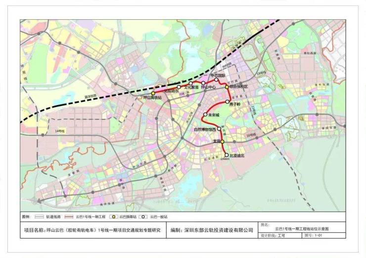 深圳坪山云巴1号线一期工程线路起于坪山高铁站,终于比亚迪站,全长8.506公里,采用高架敷设方式。