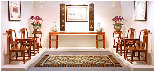 在这次的文博会上,9号馆工艺美术展馆里的伍氏兴隆展厅在众多的展厅中显得格外引人瞩目,独具特色的岭南古典建筑样式,黑、白、灰三种简约而又明确的色调,构成了和谐古雅的主体外观,青砖白瓦的外墙装饰,以及门口“清风明韵、姚黄魏紫”的匾牌,顿时让人感到一股雅韵古风之气扑面而来。展馆内部由两个大厅和四个房间构成,伍炳亮按照清式宫廷紫檀系列、明式海南黄花梨书房系列、明式越南黄花梨卧室系列、清式老红酸枝客厅系列等,将精品力作进行了分类展示,整个展厅显得美轮美奂而又错落有致,在这一方天地里构筑起中国传统家具的艺术殿堂。