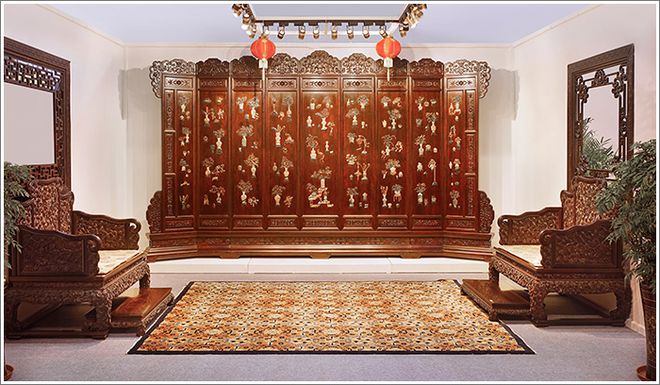 九扇围屏以榫卯相联,合围而立,肃穆庄严。在清式宫廷家具的范畴中,这种大型屏风多和宝座一起配套使用,规格等级很高,多作为礼器使用,是帝后级人物的专享,其他人不得僭制使用,因此在选材用料和造型权衡等各方面都极为考究。这件地座屏作品用料豪奢大气,雕工细腻精美,榫接巧妙合理,镶嵌严谨考究,型制宏伟庄重,品韵富丽华美;既传承了清代宫廷家具制作精华,深追清宫御制之精要,同时又融入了个人的思想情感和创意设计;秉承清代宫廷家具之精髓而又别开生面,恢宏大气而又极尽工艺之美,实为借古开今、传昭后世的精品重器,令到场的观众和专家赞不绝口,毫无争议地斩获此次文博会“中国工艺美术文化创意奖”的特别金奖。