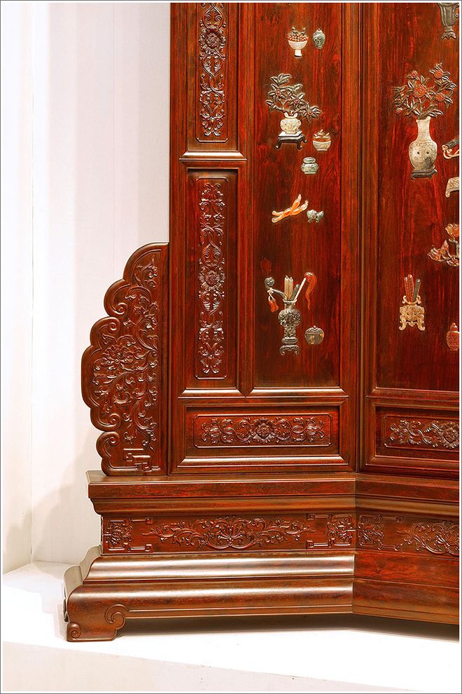 从上世纪80年代初以来,伍炳亮从事传统家具的设计制作与购藏、研究已达三十多年之久,在传统家具的制作及造型审美的认识方面积累了丰富的经验,设计制作出数千款家具作品,涵盖了传统家具的各个类别,大体以明式黄花梨及清式紫檀为重要代表,糅合了明清家具艺术的各类风格。在中国家具史上,明式家具简练空灵、古雅精丽,而清式宫廷家具则繁纹重饰,富丽华贵,成为中国家具史上的两座高峰。清朝设造办处,从全国选调较好的工匠进京,成为宫廷御用匠人,精研出了雕、嵌、描、堆等多种技法,工艺繁杂,形式多变,使清式宫廷家具成为集历代传统家具工艺之大成者。可惜的是,随着时代的变迁,这些工艺瑰宝传至今日很多已经濒临灭绝,这造成当代清式仿古家具多风格趋同,程式化严重,常让人生出“千器一面”的喟叹。令人欣慰的是,伍炳亮的清式家具作品不落此的程式化俗套,他穷三十余年之力,深研清式宫廷家具的工艺技法,不仅完整系统的继承了传统工艺精髓,款型丰富雅正、雕工细致入微、刀法风格多变,且能在曲尽其妙之间别出心裁,借古开今。