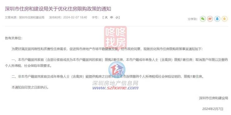 2月7日(春节前),深圳住建局发布《关于优化住房限购政策的通知》。深户家庭和成年单身人士购房取消落户年限,也不再要求缴纳个税或社保年限;非深户家庭及成年单身人士购房,缴纳社保或个税年限降为三年。