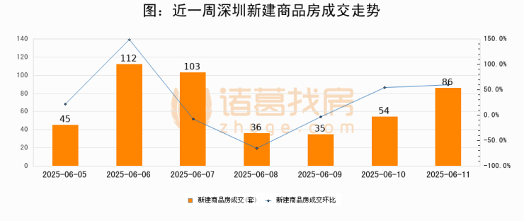 根据深圳市住房和城乡建设局数据显示,2025年06月11日深圳新建商品房成交86套,较昨日增加32套,环比上涨59.3%