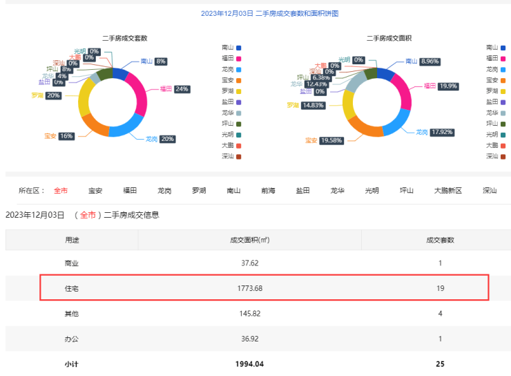 12月3日二手房住宅网签19套。宝安4套;福田4套;龙岗5套;罗湖2套;南山2套;盐田0套;龙华1套;光明0套;坪山1套;大鹏0套。